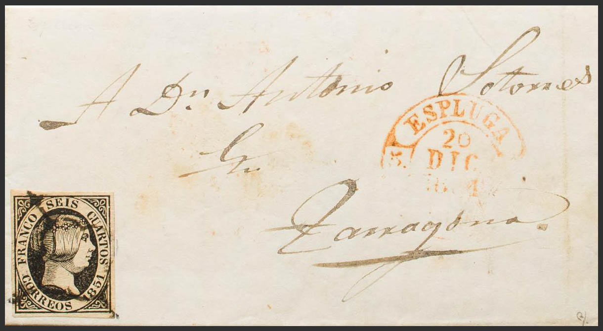 6. 1851. 6 cuartos black. ESPLUGA FROM FRANCOLI to TARRAGONA. In the front baeza ESPLUGA / CATALONIA. MAGNIFICENT AND RARE. Ex-Blight.