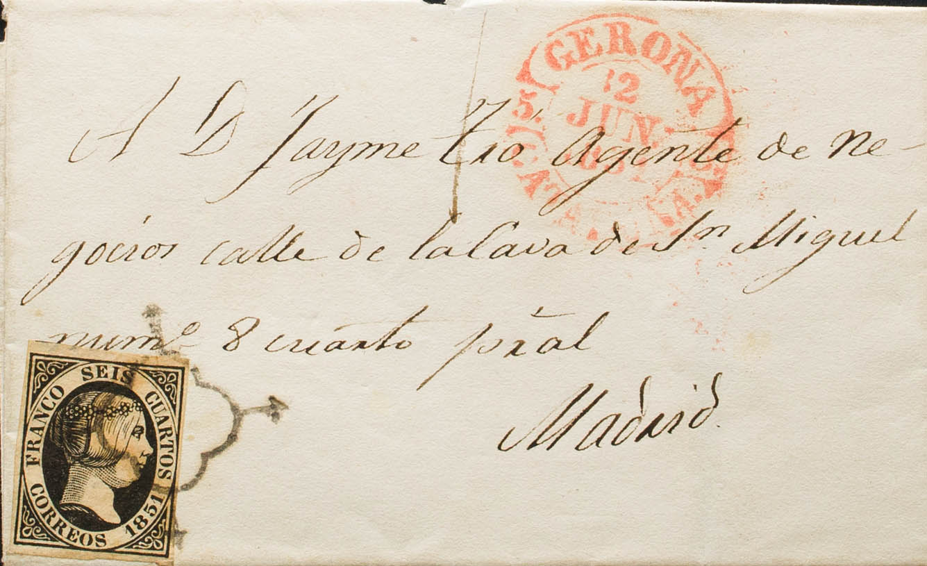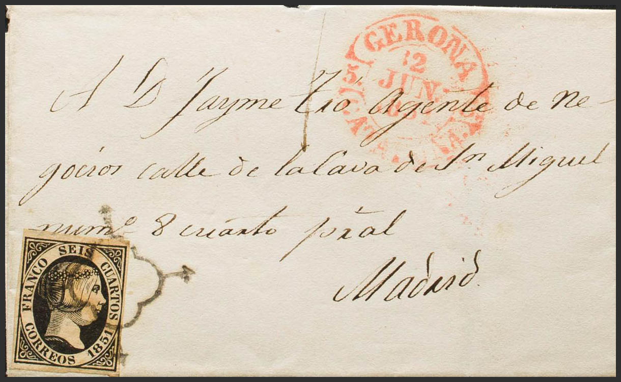 6. 1851. 6 cuartos black. GIRONA to MADRID. In the front baeza GERONA / CATALONIA. MAGNIFICENT. Ex-Blight.