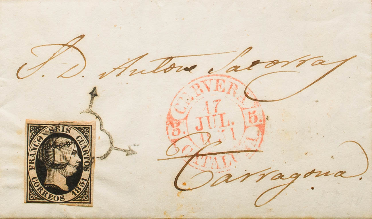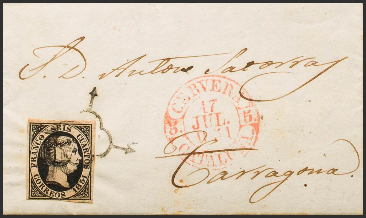 6. 1851. 6 cuartos black. SANTA COLOMA DE QUERALT to TARRAGONA. On the front baeza CERVERA / CATALUÑA, on the back mark of arrival in Tarragona, in black. MAGNIFICENT AND RARE. Ex-Blight.