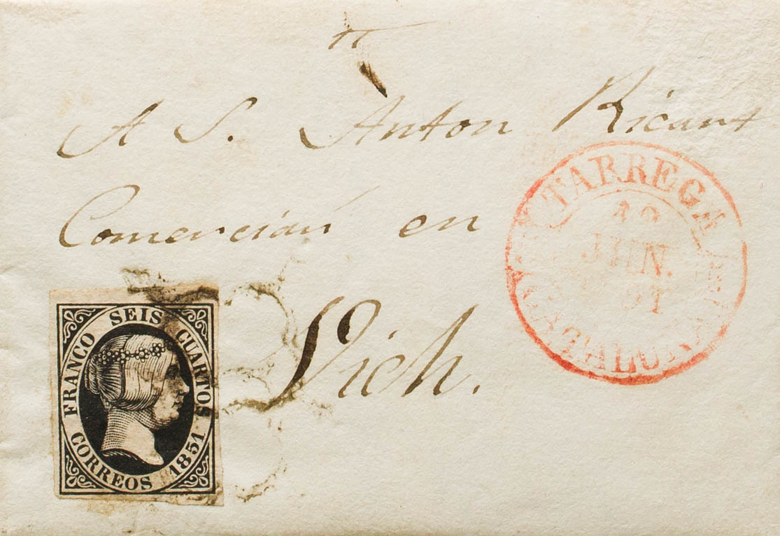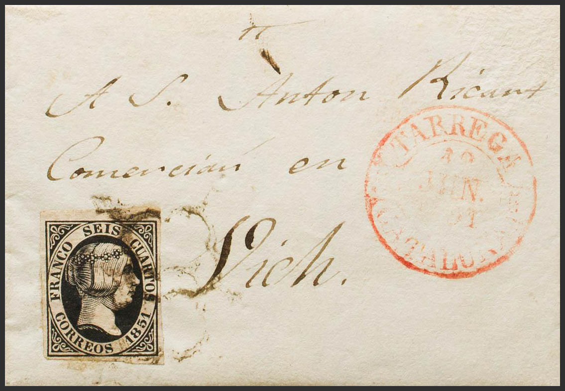 6. 1851. 6 cuartos black. TARREGA to VICH. In the baeza front TARREGA / CATALONIA. MAGNIFICENT AND RARE. Ex-Blight.