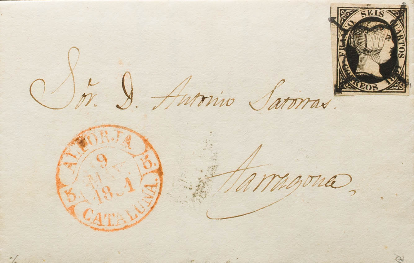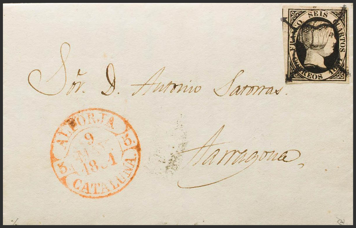6. 1851. 6 cuartos black. POBOLEDA to TARRAGONA. In the front baeza ALFORJA / CATALUÑA. MAGNIFICENT AND RARE. Ex-Blight.