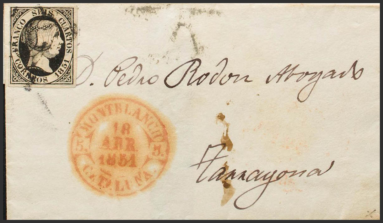 6. 1851. 6 cuartos black. MONTBLANCH to TARRAGONA. In the front baeza MONTBLANCH / CATALONIA. MAGNIFICENT AND RARE. Ex-Blight.