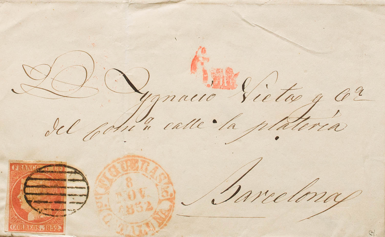 6. 1852. 6 cuartos pink. FIGUERAS to BARCELONA. In the front baeza FIGUERAS / CATALONIA. MAGNIFICENT. Ex-Blight.