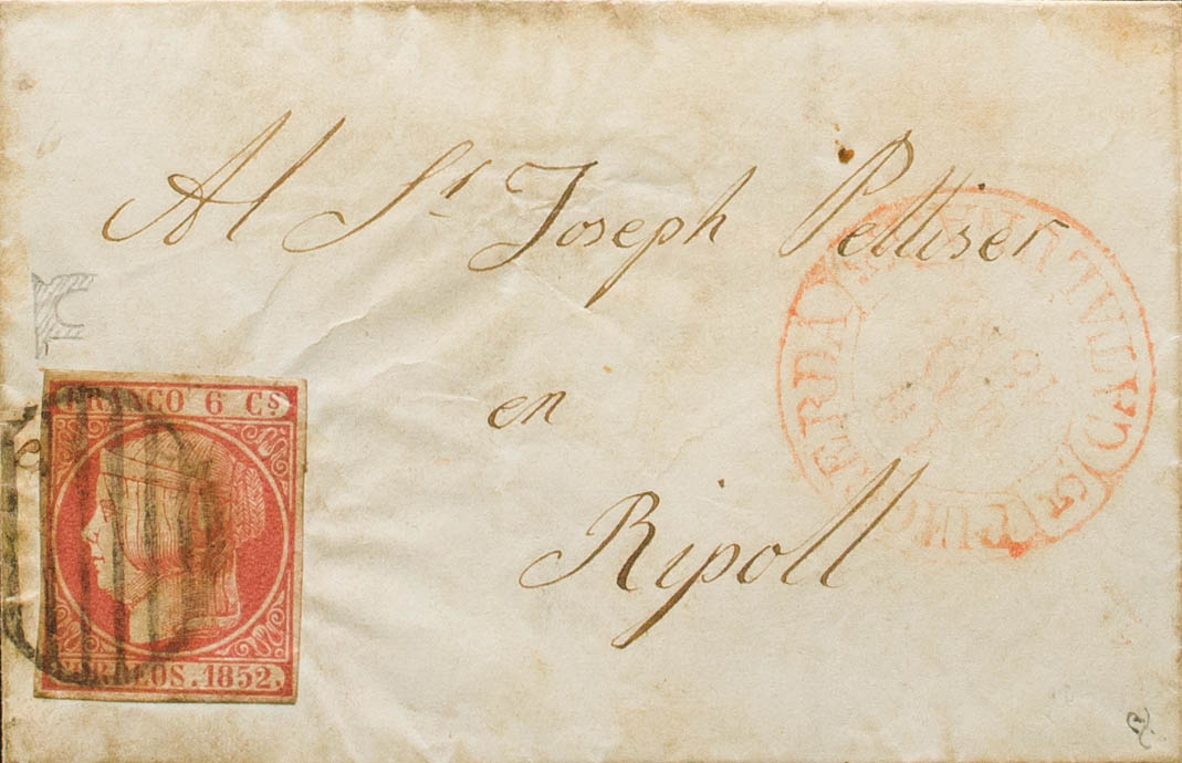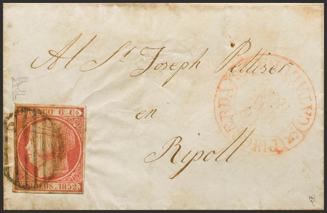 12. 1852. 6 cuartos pink. PUIGCERDA to RIPOLL. In the front baeza PUIGCERDA / CATALONIA. MAGNIFICENT AND RARE. Ex-Blight.