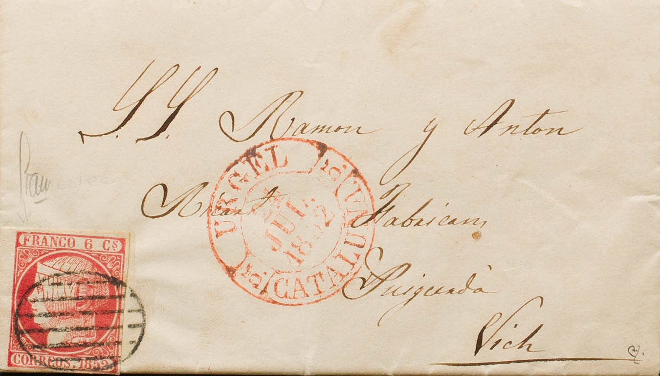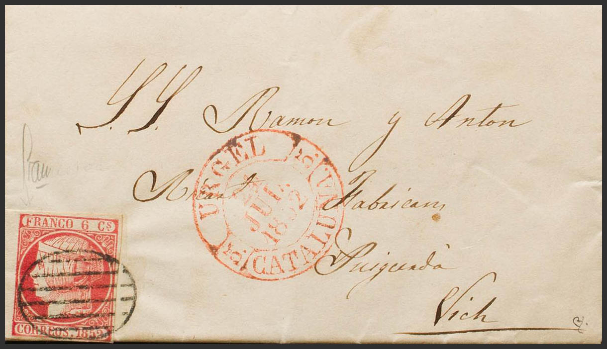 12. 1852. 6 cuartos pink. SEO FROM URGEL to VICH. In the baeza front URGEL / CATALONIA. MAGNIFICENT AND VERY RARE. Ex-Blight.