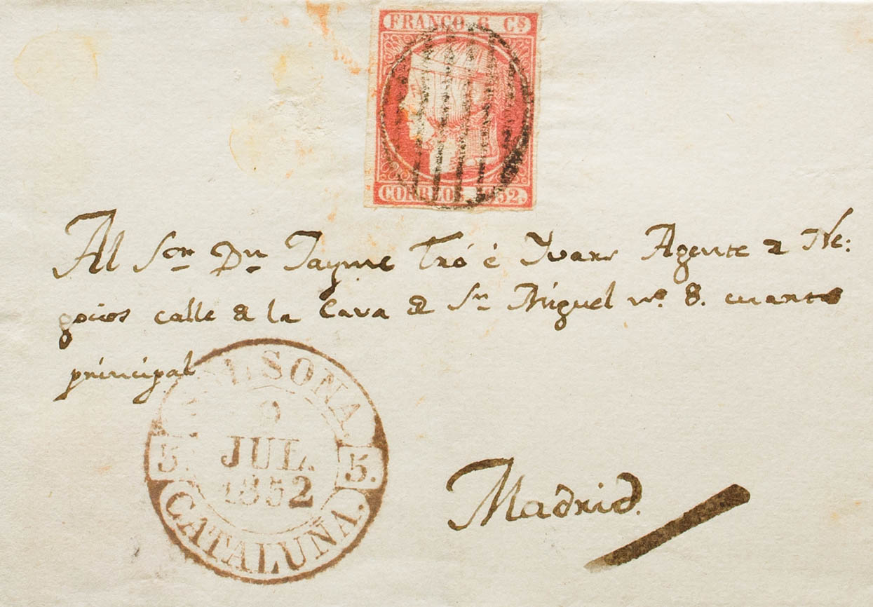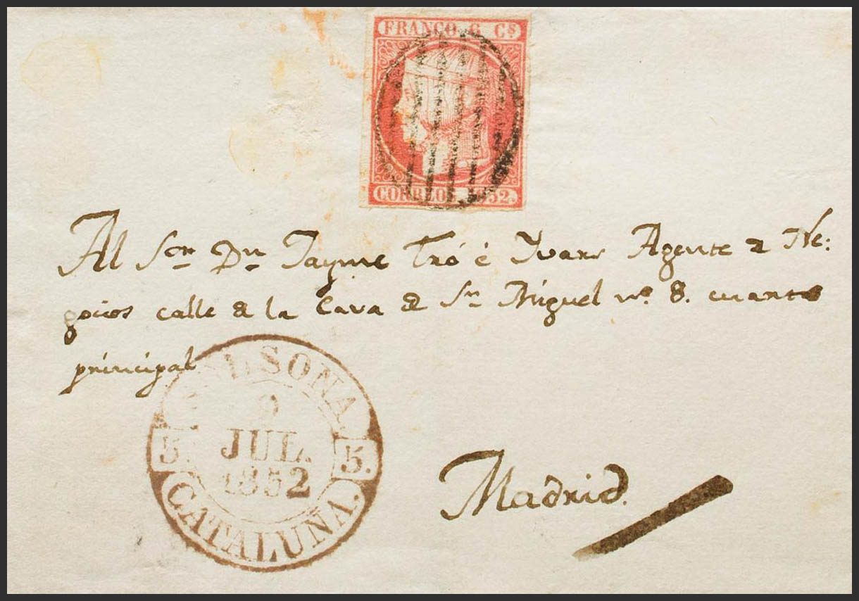 12. 1852. 6 cuartos pink. SOLSONA to MADRID. In the front baeza SOLSONA / CATALONIA. MAGNIFICENT AND RARE. Ex-Blight.