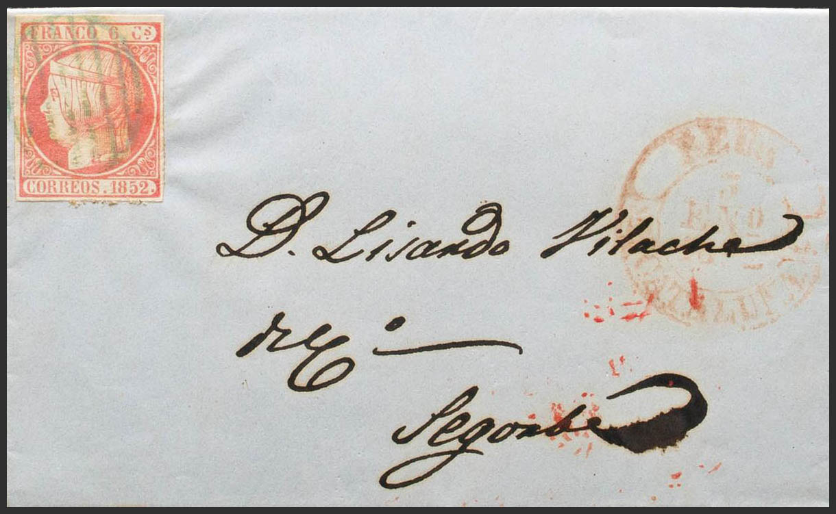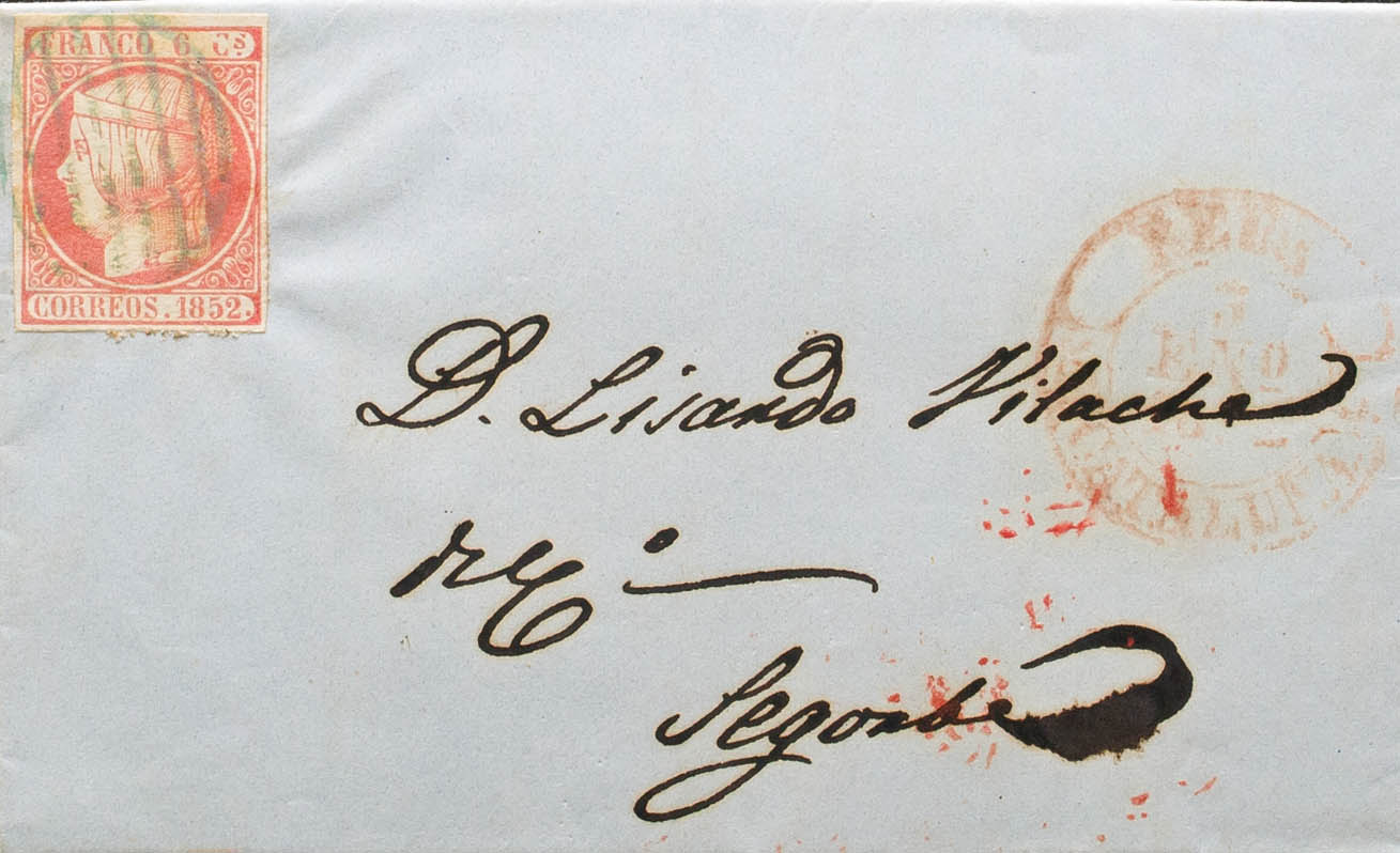 12. 1852. 6 cuartos pink. REUS to SEGORBE. Postmark GRILL, in blue. MAGNIFICENT. Ex-Blight.
