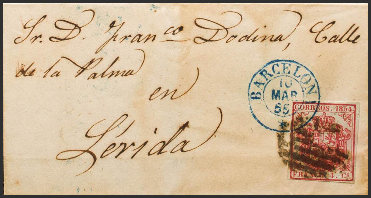 33. 1855. 4 carmine cuartos . BARCELONA to LERIDA. GRILL postmark and date stamp BARCELONA / * (Type I), in blue. MAGNIFICENT. Ex-Blight.