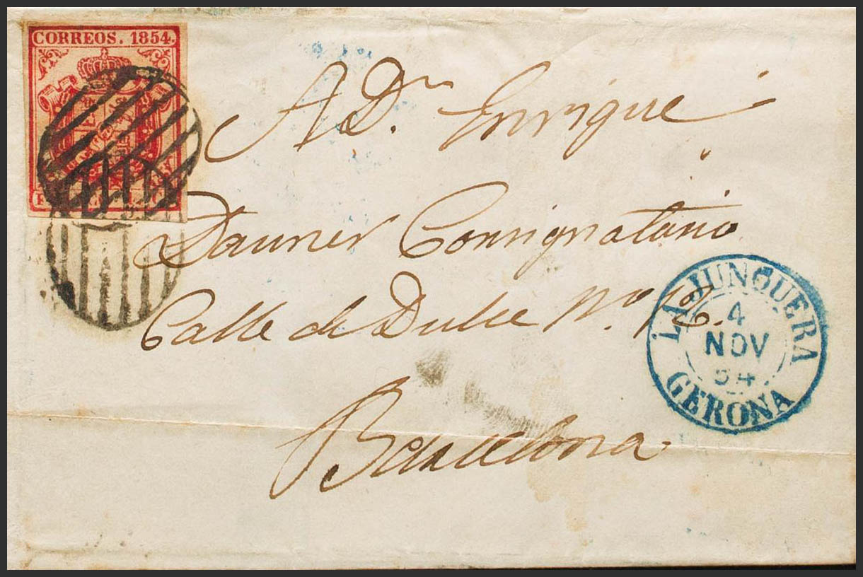 33. 1854. 4 carmine cuartos . LA JUNQUERA to BARCELONA. On the front date LA JUNQUERA / GERONA (Type I), in blue. MAGNIFICENT. Ex-Blight.