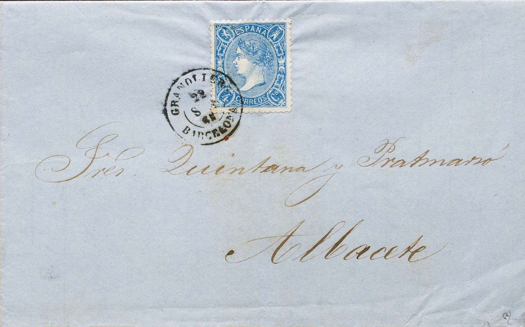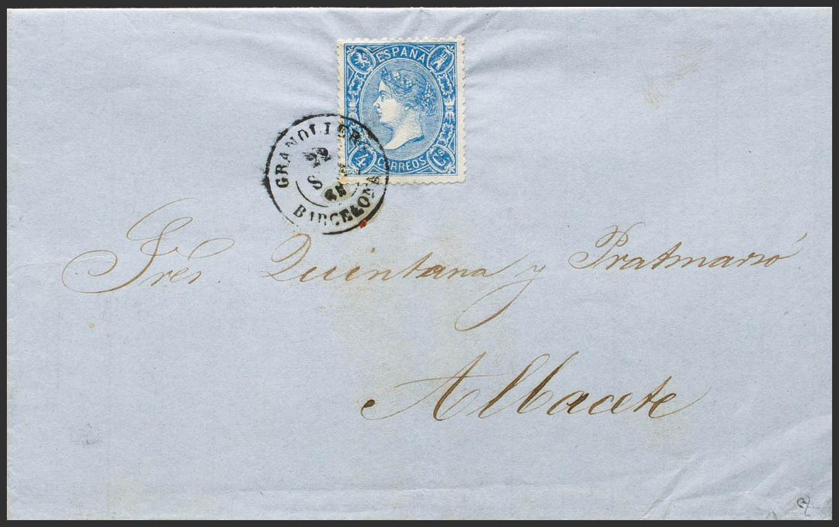 75. 1865. 4 cuartos blue. GRANOLLERS to ALBACETE. Postmark GRANOLLERS / BARCELONA. MAGNIFICENT. Ex-Blight.