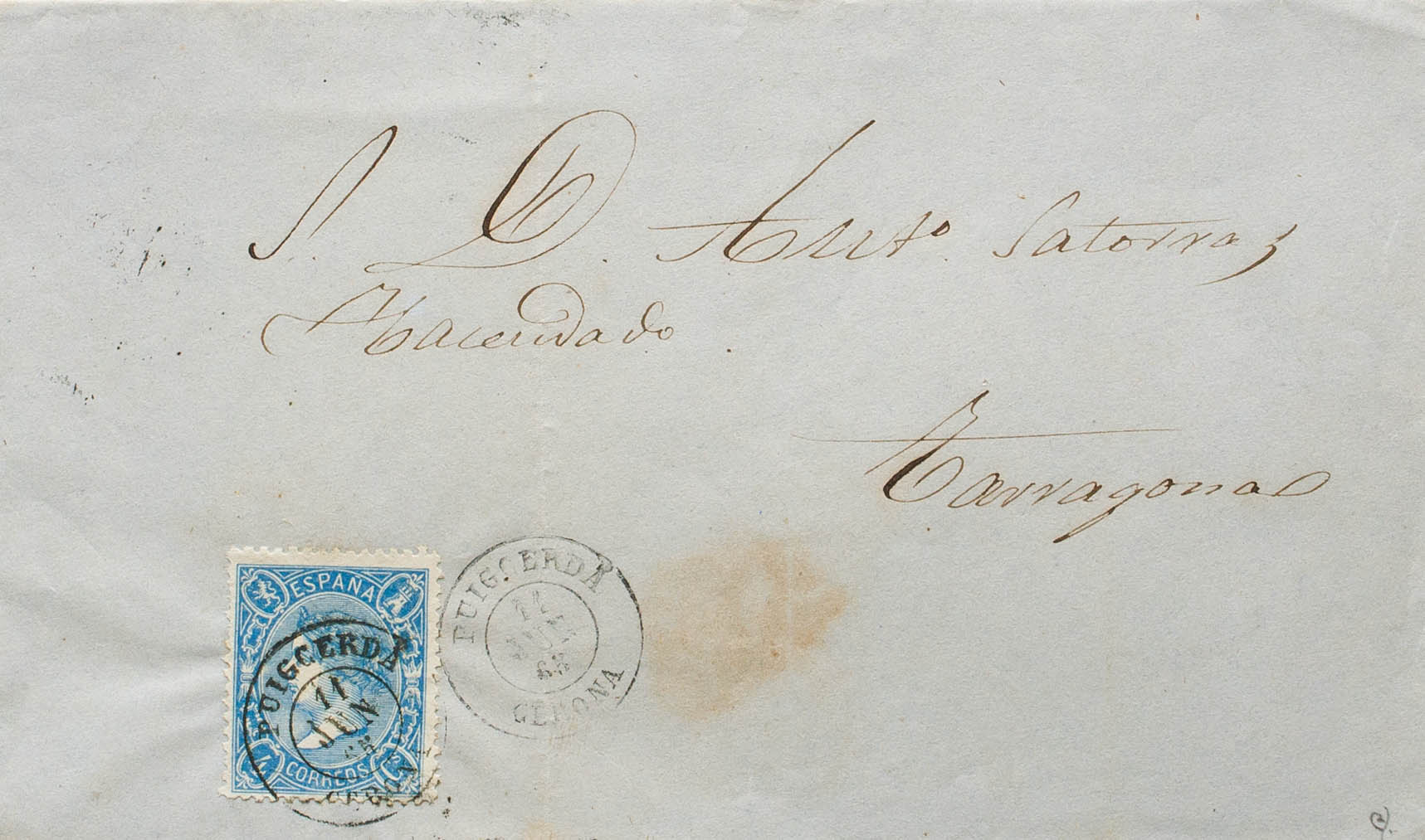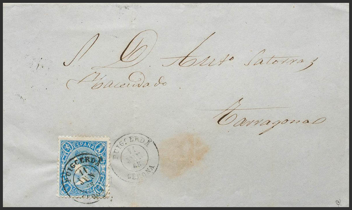 75. 1865. 4 cuartos blue. PUIGCERDA to TARRAGONA. Postmark PUIGCERDA / GERONA. MAGNIFICENT. Ex-Blight.