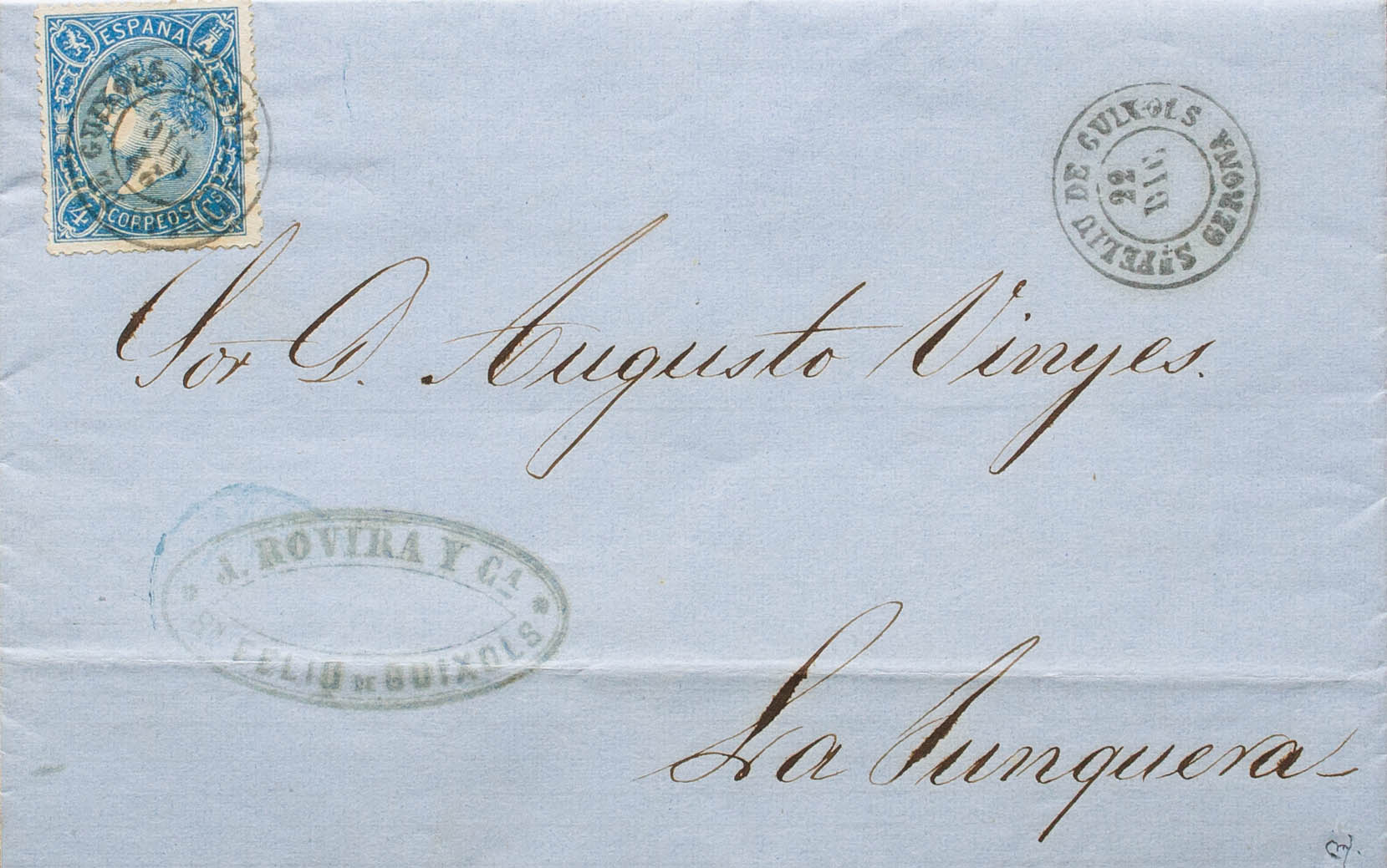 75. 1865. 4 cuartos blue. SAN FELIU DE GUIXOLS to LA JUNQUERA. Postmark SN. FELIU DE GUIXOLS / GERONA. MAGNIFICENT. Ex-Blight.