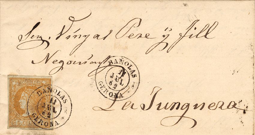 52. 1860. 4 cuartos yellow. BATHROOMS to LA JUNQUERA. Postmark BAÑOLAS / GERONA. MAGNIFICENT.