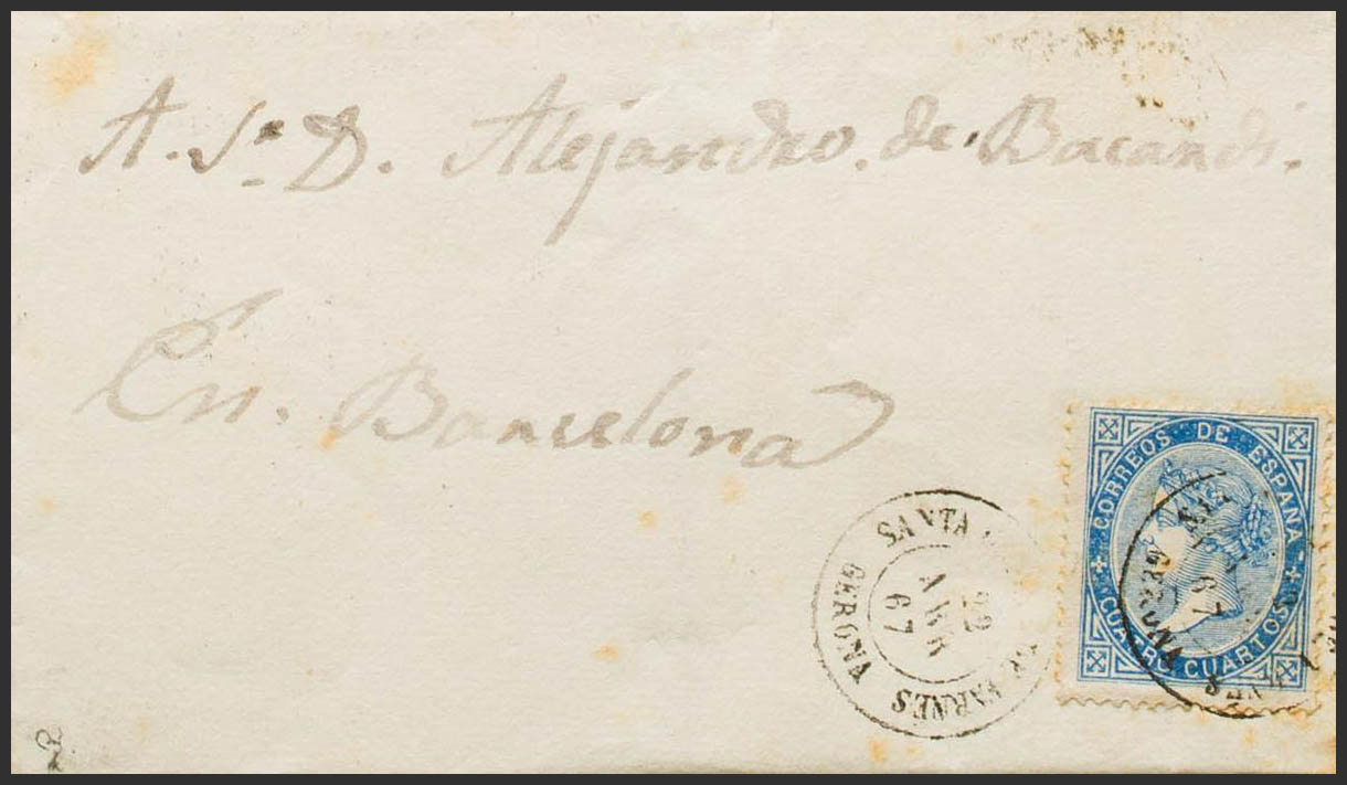 88. 1867. 4 cuartos blue. SANTA COLOMA DE FARNES to BARCELONA. Postmark SANTA COLOMA DE FARNES / GERONA. MAGNIFICENT. Ex-Blight.