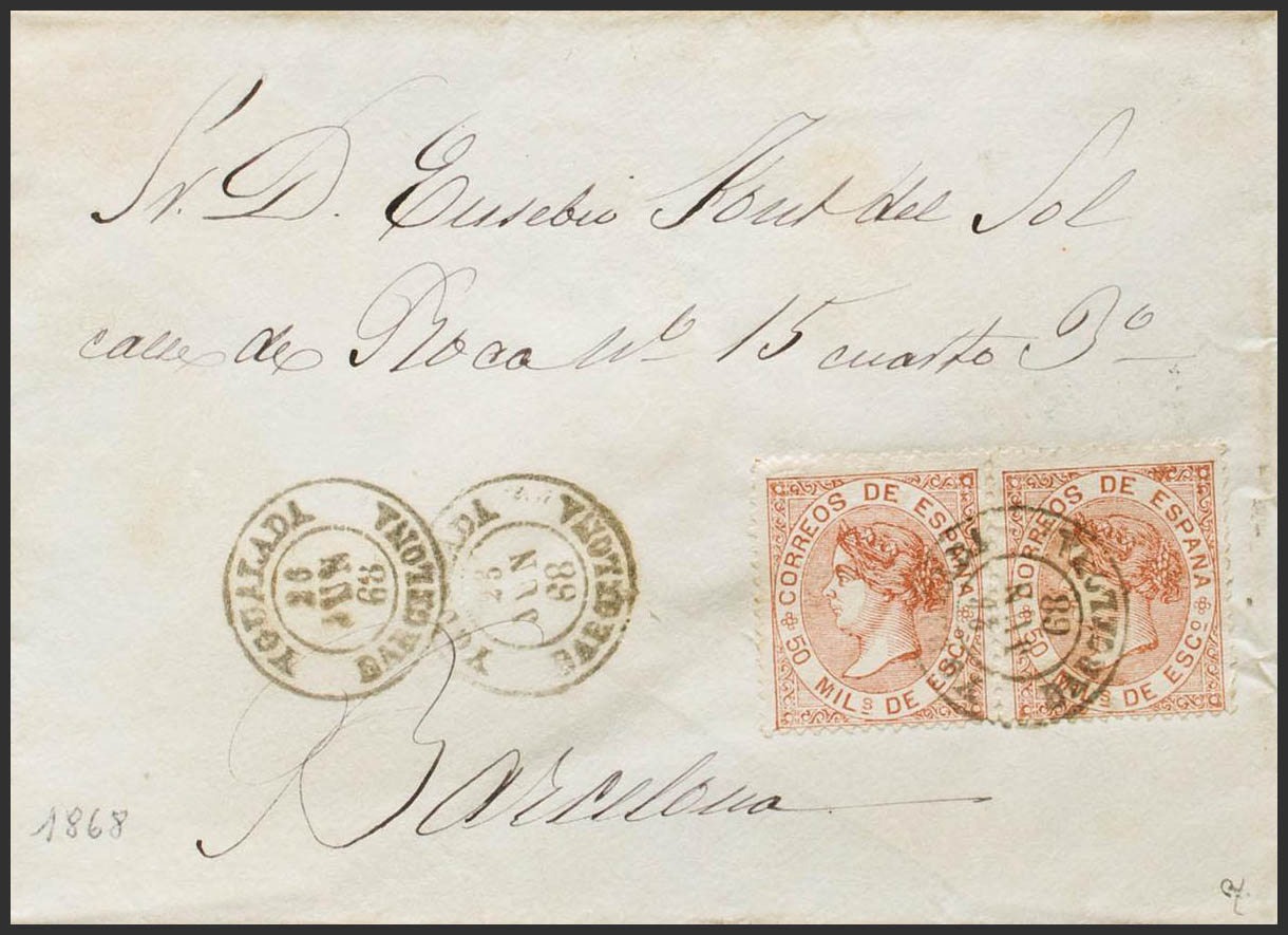 96(2). 1868. 50 mils yellow chestnut, two stamps. EQUAL TO BARCELONA. Postmark YGUALADA / BARCELONA. MAGNIFICENT. Ex-Blight.