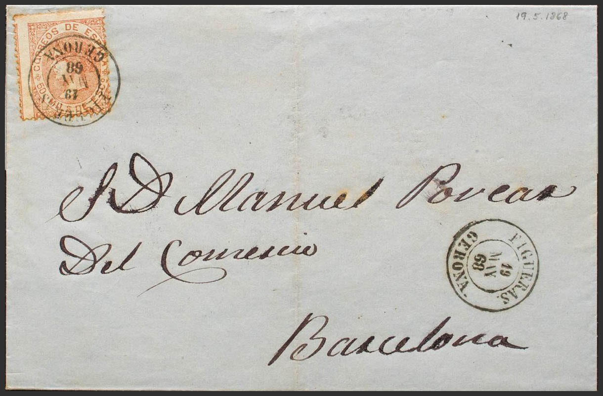 96. 1868. 50 mils yellow chestnut. FIGUERAS to BARCELONA. Postmark FIGUERAS / GERONA. MAGNIFICENT. Ex-Blight.