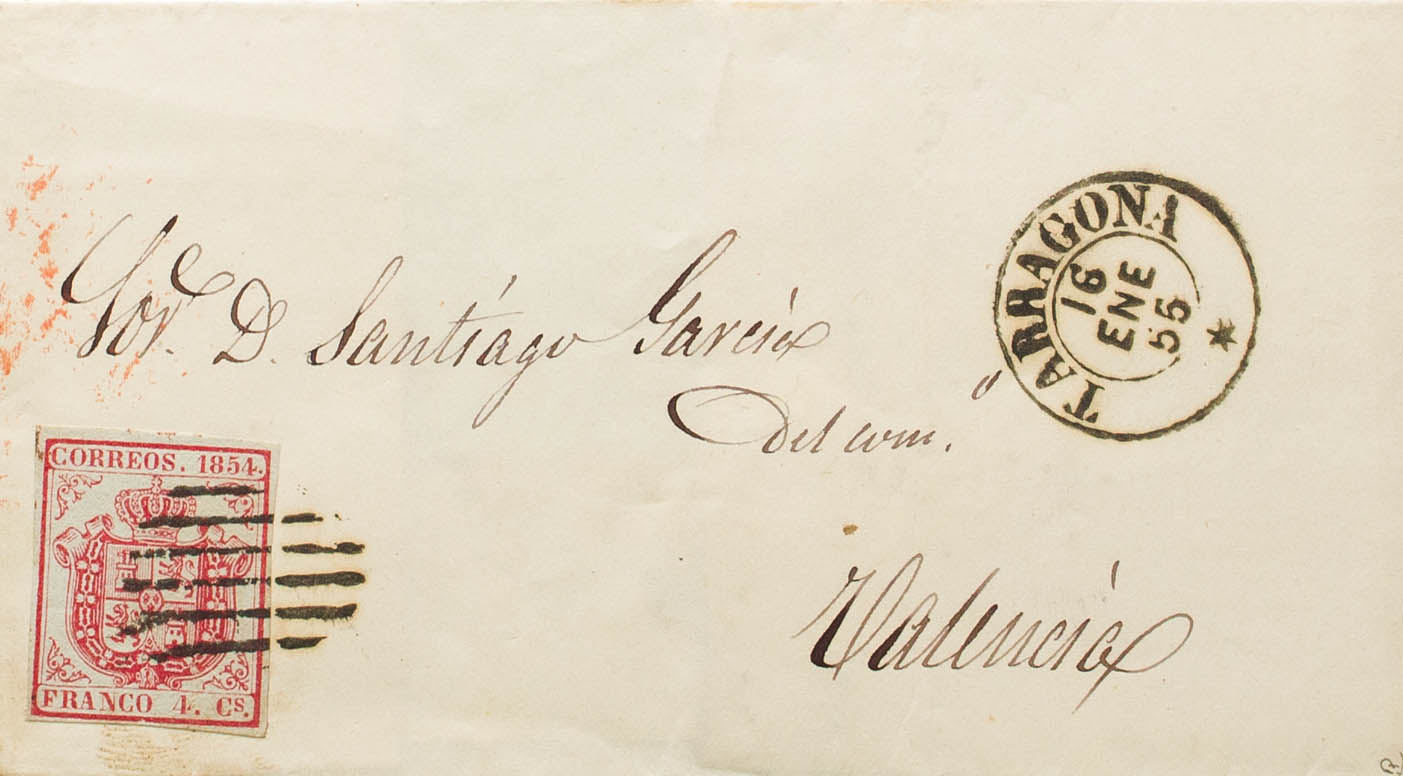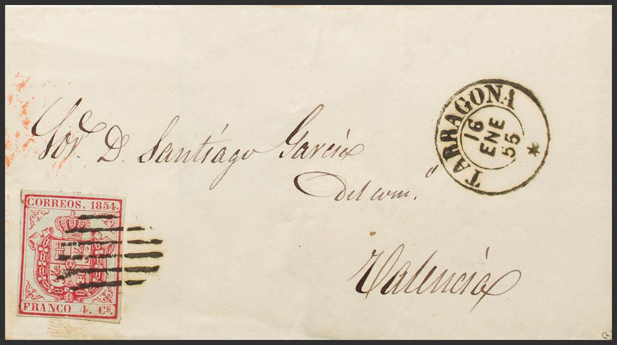 33A. 1855. 4 carmine cuartos . TARRAGONA to VALENCIA. On the front dater TARRAGONA / * (Type I). MAGNIFICENT. Ex-Blight.