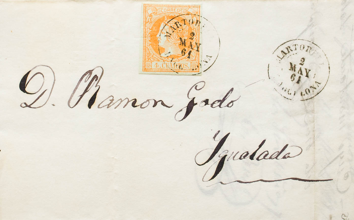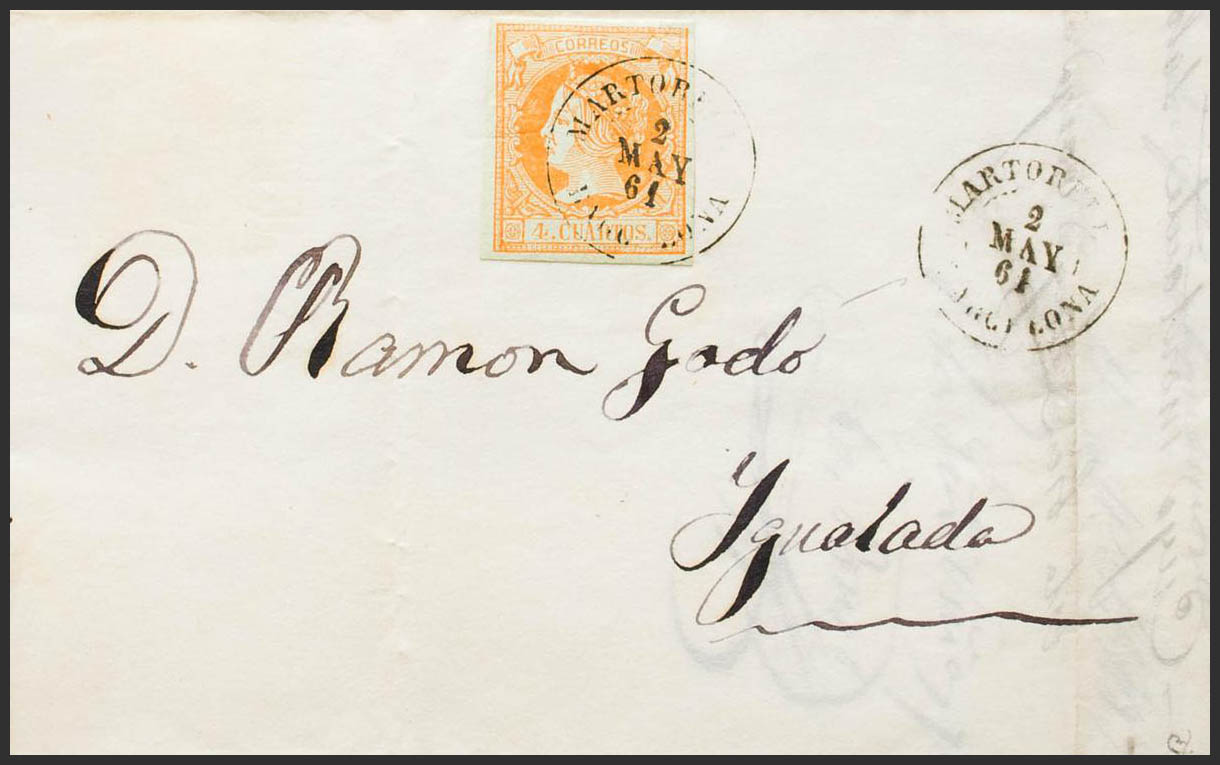 52. 1861. 4 orange cuartos . SUBIRATS to EQUALADA. Postmark MARTORELL / BARCELONA. MAGNIFICENT AND RARE. Ex-Blight.