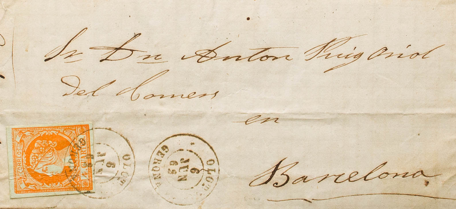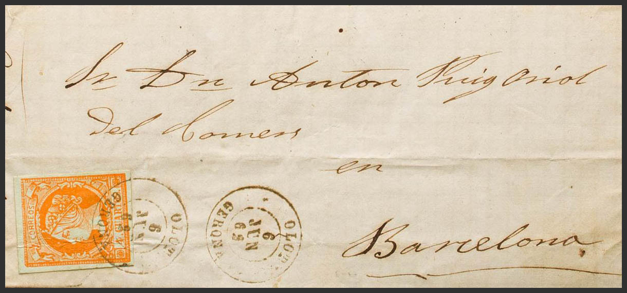 52. 1862. 4 orange cuartos . OLOT to BARCELONA. Postmark OLOT / GERONA. MAGNIFICENT AND RARE. Ex-Blight.