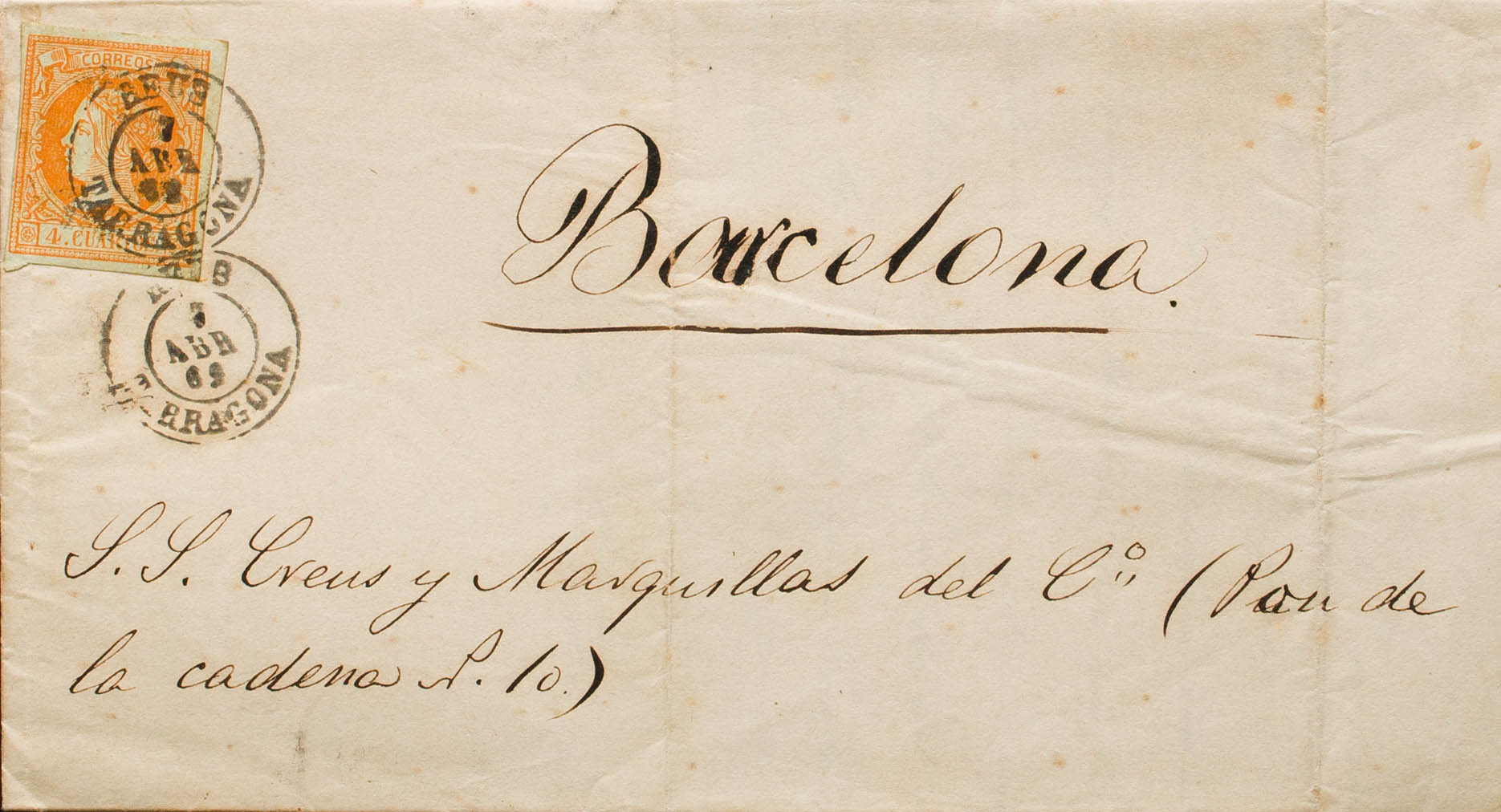 52. 1862. 4 orange cuartos . REUS to BARCELONA. Postmark REUS / TARRAGONA. MAGNIFICENT. Ex-Blight.