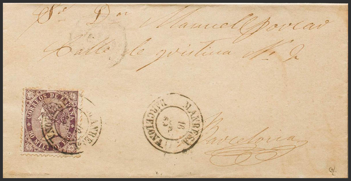 98. 1869. 50 mils violet. SALLENT to BARCELONA. Postmark MANRESA / BARCELONA. MAGNIFICENT. Ex-Blight.