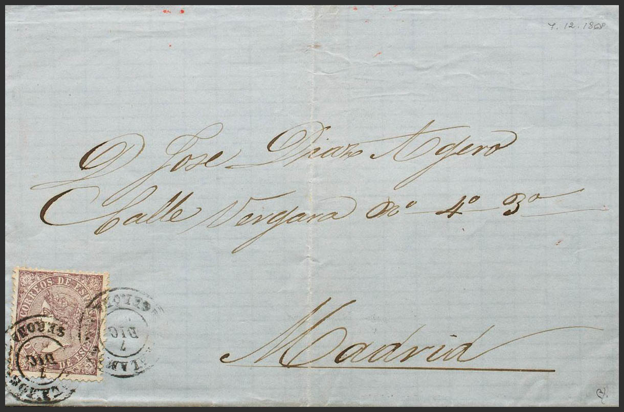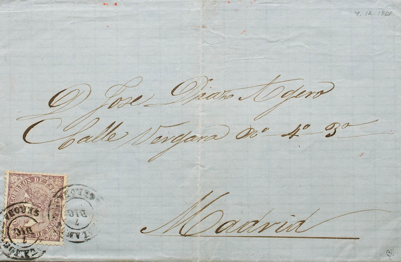 98. 1868. 50 mils violet. PALAMOS to MADRID. Postmark PALAMOS / GERONA. MAGNIFICENT. Ex-Blight.