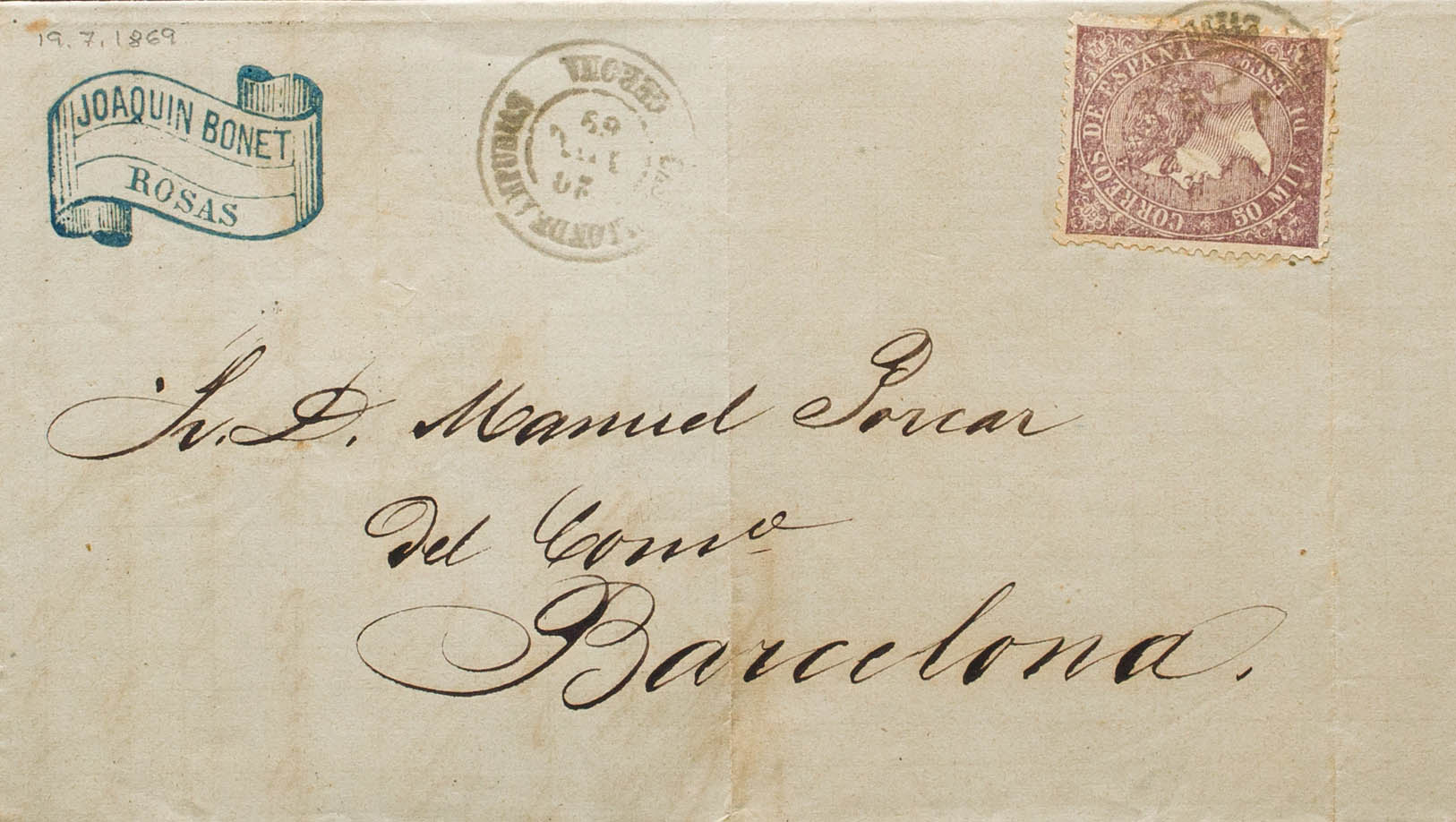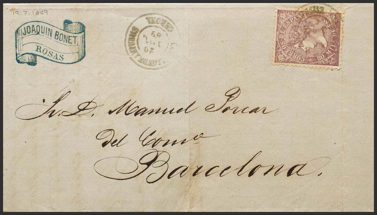 98. 1869. 50 mils violet. ROSES to BARCELONA. Postmark CASTELLON DE AMPURIAS / GERONA. MAGNIFICENT. Ex-Blight.