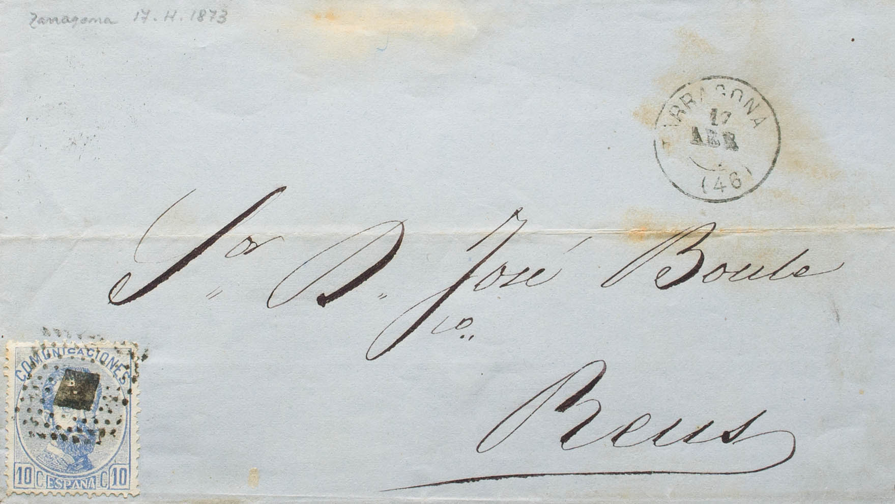 121. 1873. 10 overseas cts. TARRAGONA to REUS. On the front dater TARRAGONA / REUS. MAGNIFICENT. Ex-Blight.