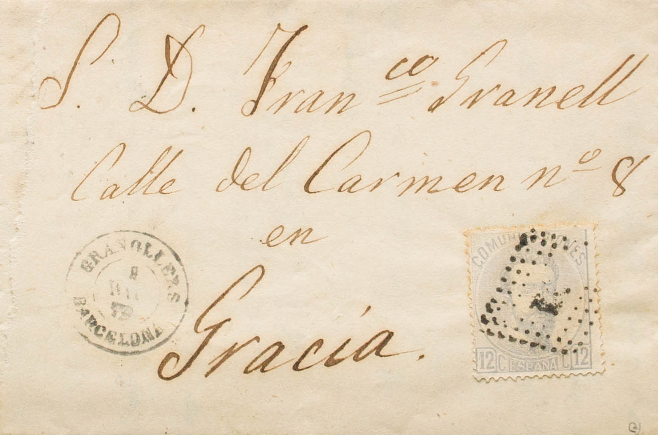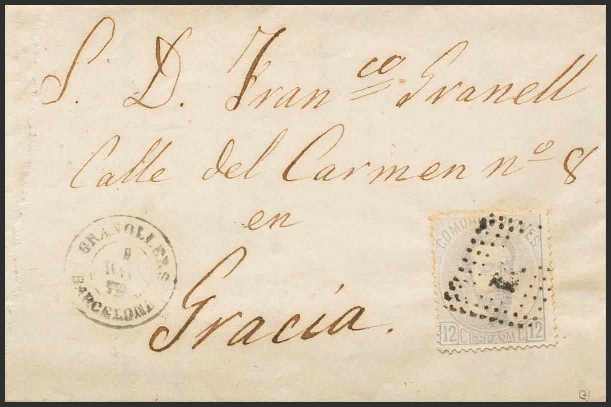 122. 1872. 12 cts lilac grey. GRANOLLERS to GRACE. On the front date GRANOLLERS / BARCELONA. MAGNIFICENT. Ex-Blight.