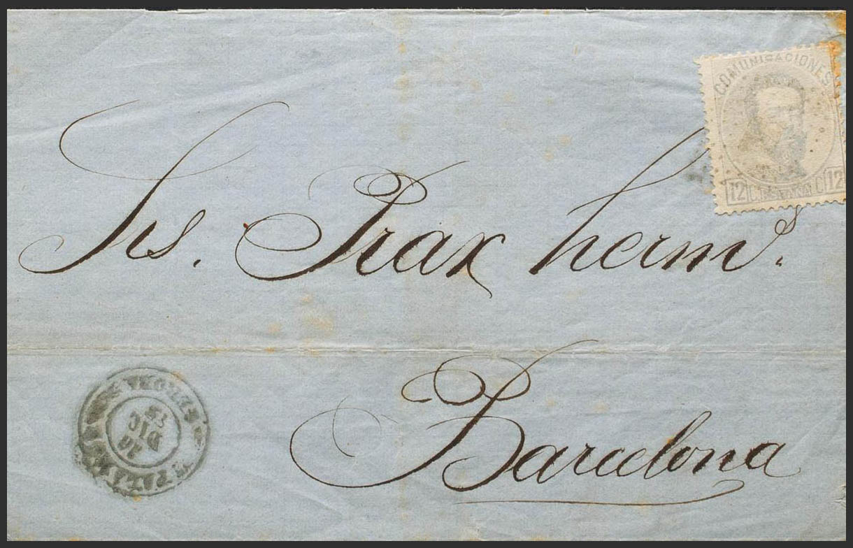 122. 1872. 12 cts lilac grey. PALAMOS to BARCELONA. On the front dater PALAMOS / GERONA. MAGNIFICENT AND RARE. Ex-Blight.