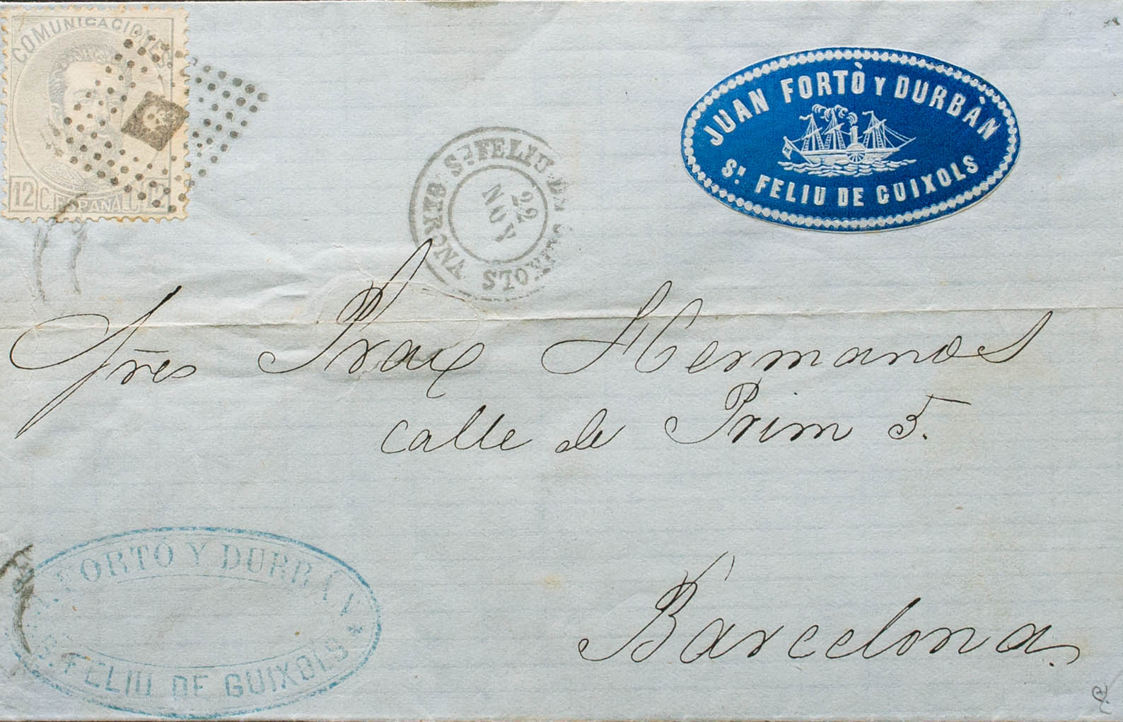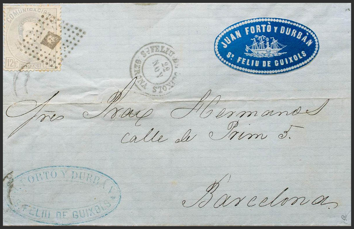 122. 1872. 12 cts lilac grey. SAN FELIU DE GUIXOLS to BARCELONA. On the front dater SN. FELIU DE GUIXOLS / GERONA. MAGNIFICENT AND RARE. Ex-Blight.