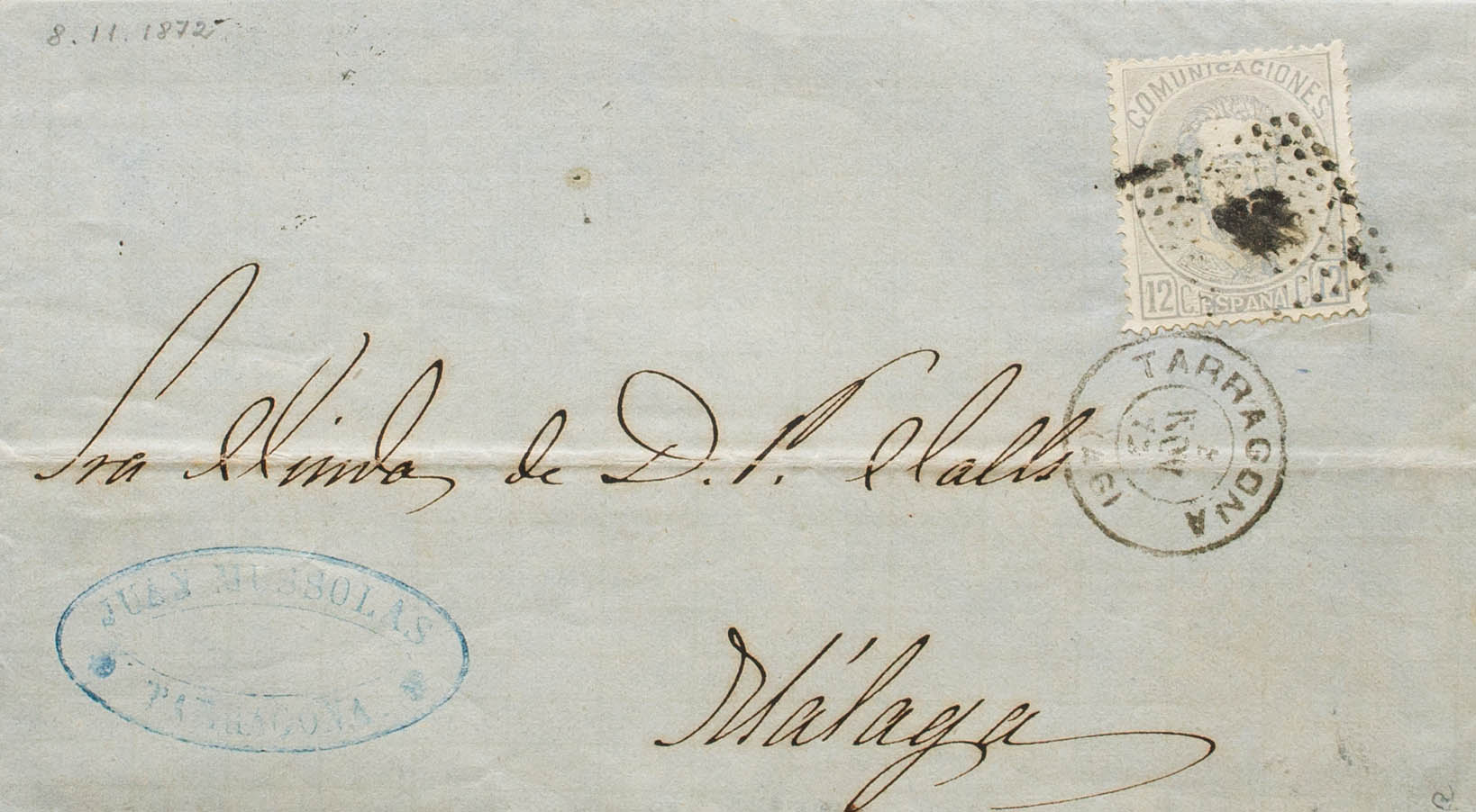 122. 1872. 12 cts lilac grey. TARRAGONA to MALAGA. On the front dater TARRAGONA / (46). MAGNIFICENT. Ex-Blight.