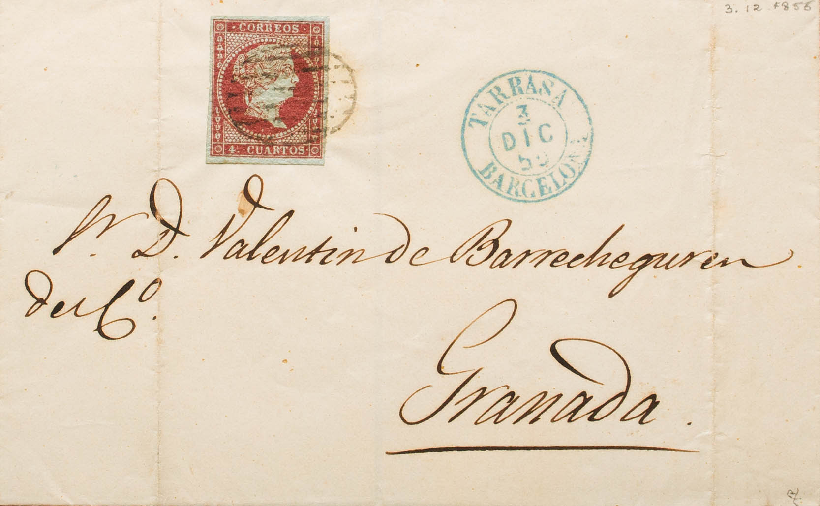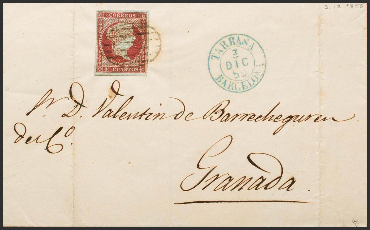 English 40. 1855. 4 red cuartos . TARRASA to GRANADA. On the front dater TARRASA / BARCELONA (Type I), in blue. MAGNIFICENT. Ex-Blight.