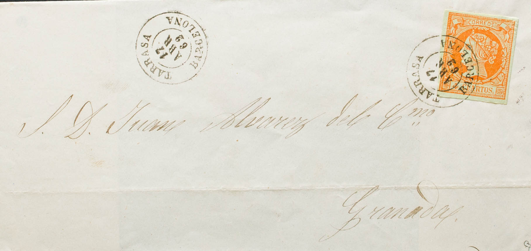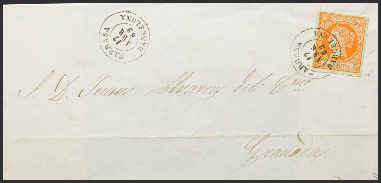 52. 1862. 4 orange cuartos . TARRASA to GRANADA. Postmark TARRASA / BARCELONA. MAGNIFICENT. Ex-Blight.