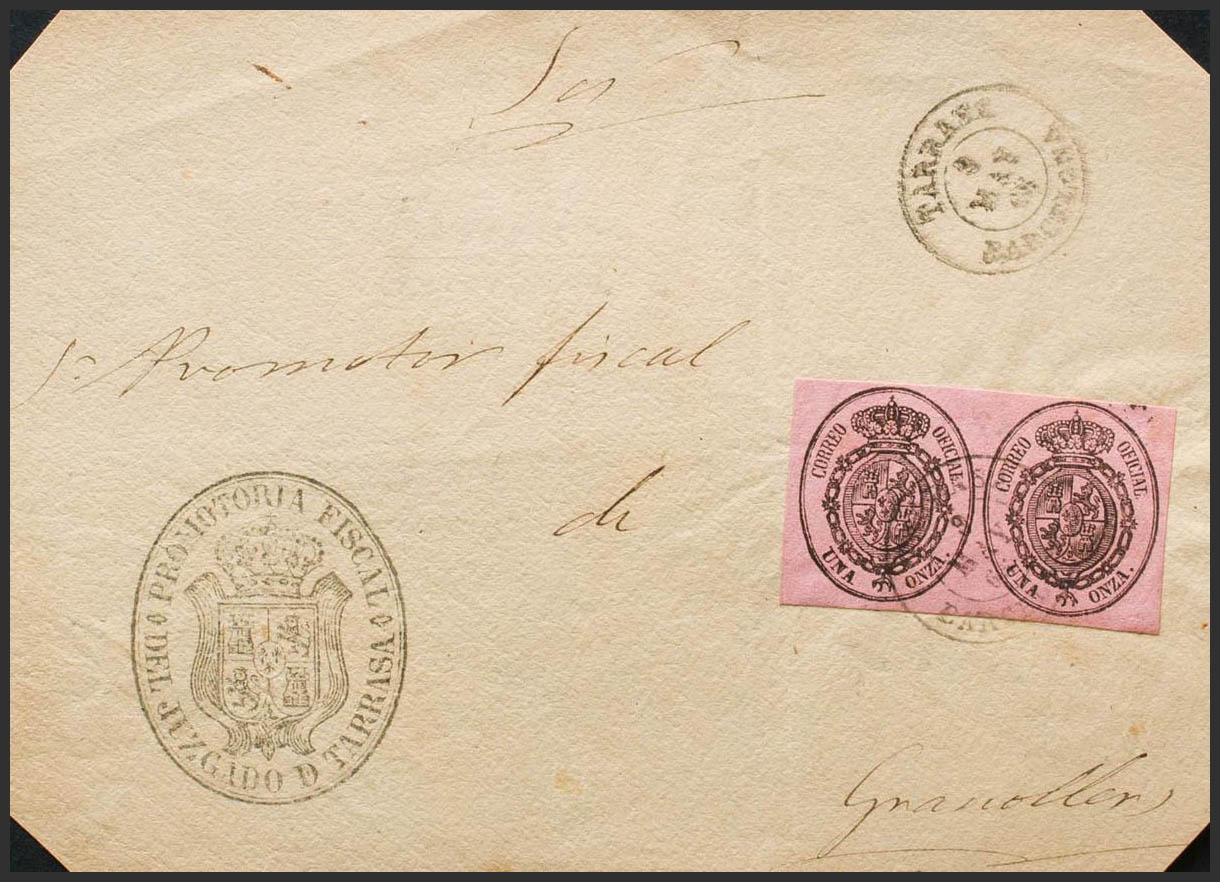 36(2). 1868. 1 oz black on pink, pair. Front of Judicial Escrow of TARRASA to GRANOLLERS. Postmark TARRASA / BARCELONA. MAGNIFICENT. Ex-Blight.