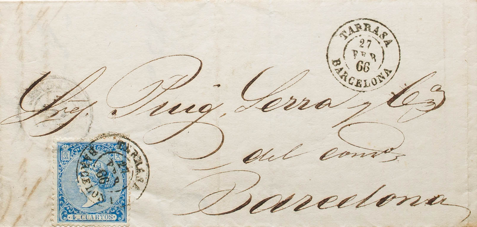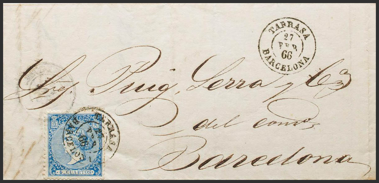 81. 1866. 4 cuartos blue. TARRASA to BARCELONA. Postmark TARRASA / BARCELONA. MAGNIFICENT. Ex-Blight.