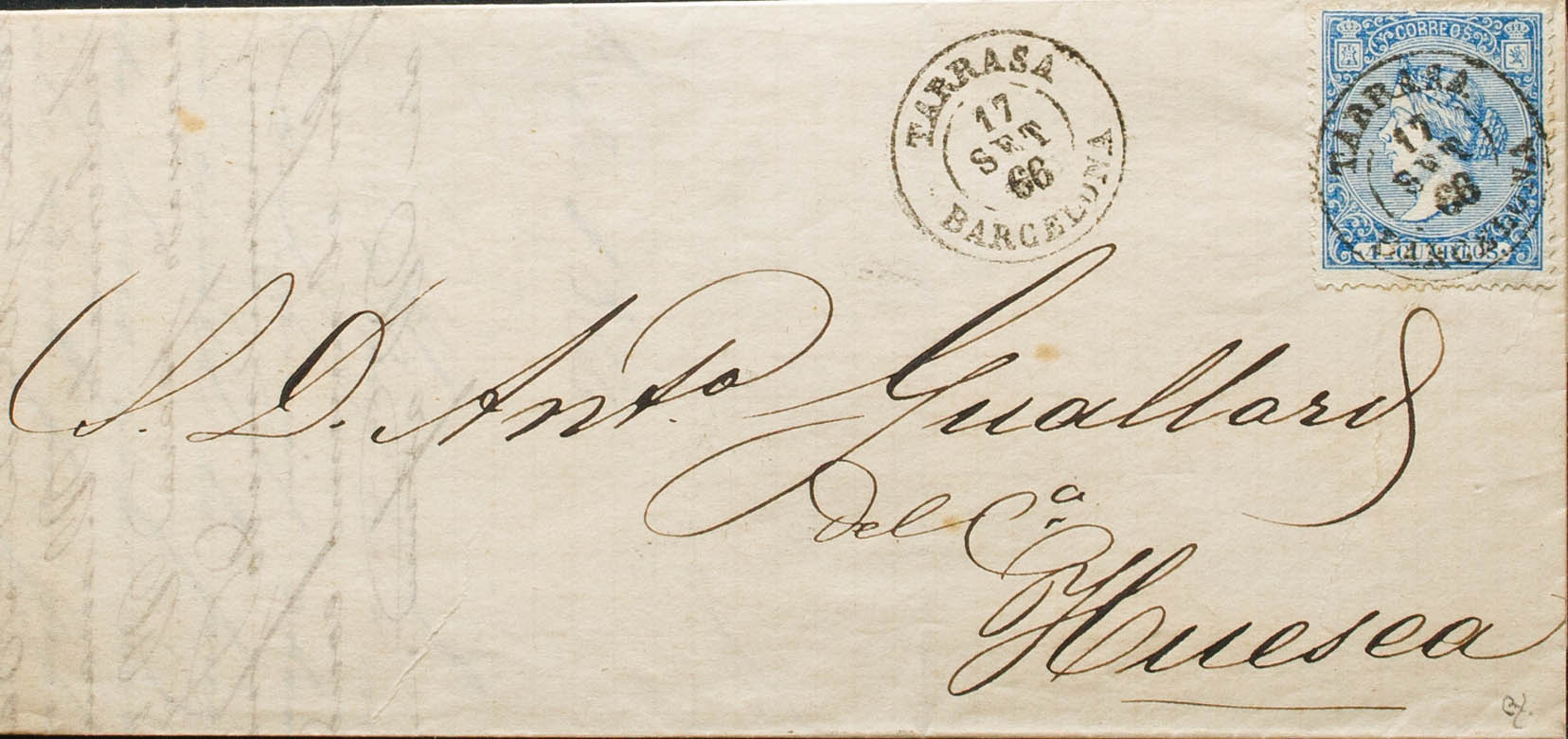 81. 1866. 4 cuartos blue. TARRASA to HUESCA. Postmark TARRASA / BARCELONA. MAGNIFICENT. Ex-Blight.