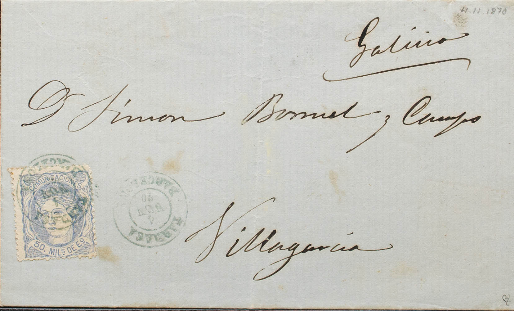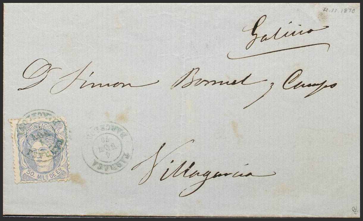 107. 1870. 50 mils overseas. TARRASA to VILLAGARCIA. Postmark TARRASA / BARCELONA, in blue. MAGNIFICENT AND RARE. Ex-Blight.