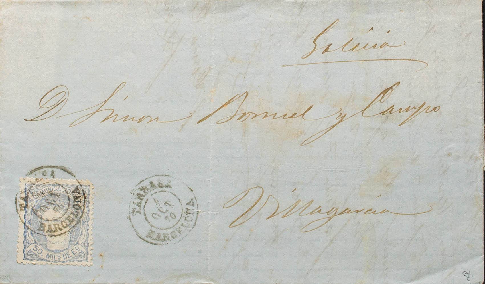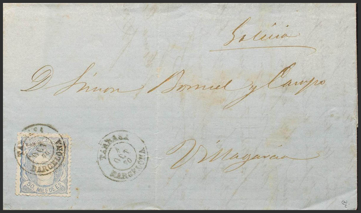 107. 1870. 50 mils overseas. TARRASA to VILLAGARCIA. Postmark TARRASA / BARCELONA. MAGNIFICENT. Ex-Blight.