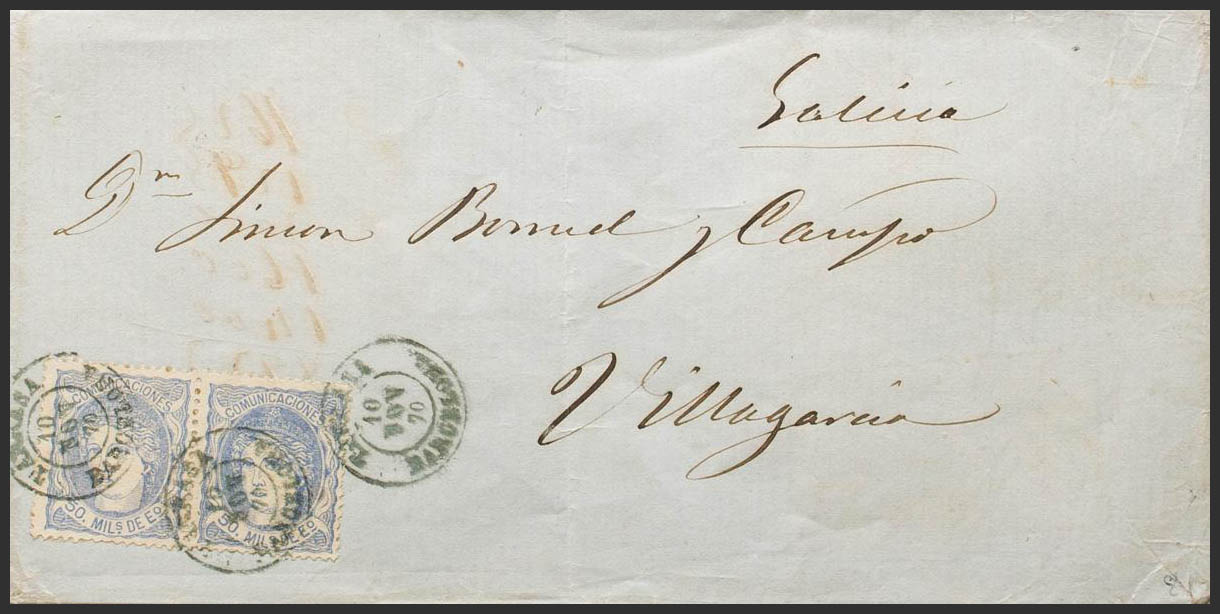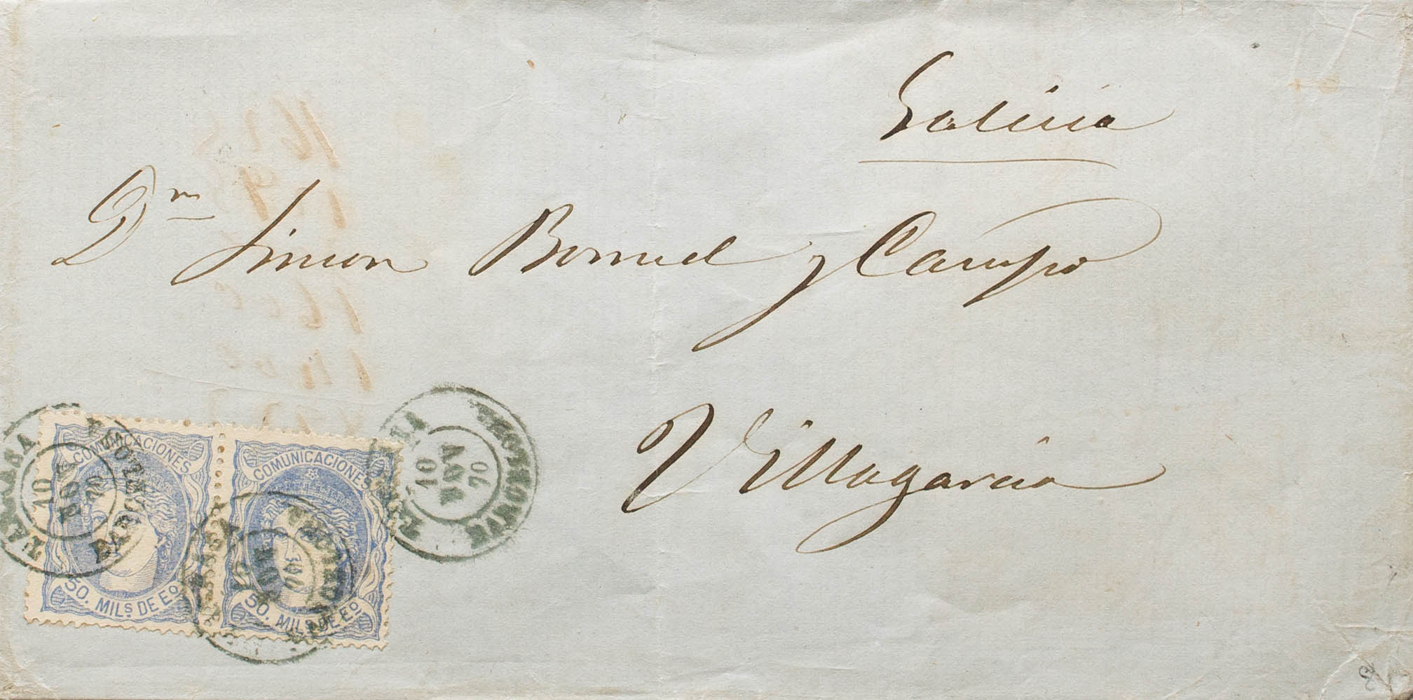107(2). 1870. 50 mils overseas, pair. TARRASA to VILLAGARIA. Postmark TARRASA / BARCELONA, in blue. MAGNIFICENT AND RARE. Ex-Blight.