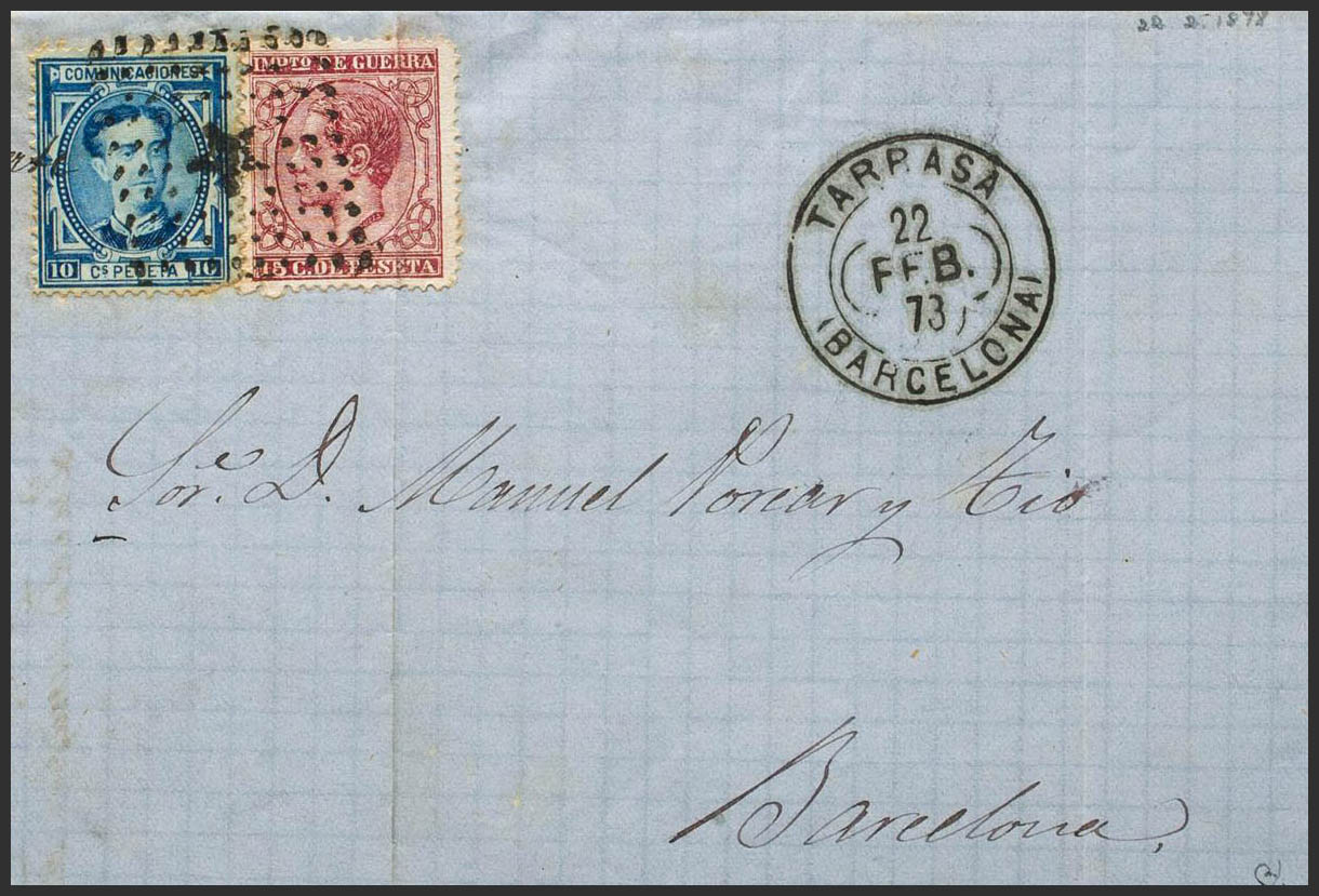 175, 188. 1878. 10 cts blue and 15 cts carmine (archive fold). TARRASA to BARCELONA. PRETTY. Ex-Blight.