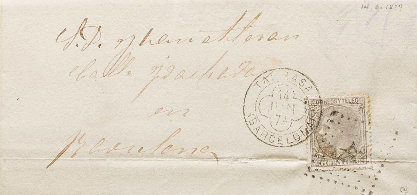 204. 1879. 25 cts gray (file fold). TARRASA to BARCELONA. RHOMB OF DOTS postmark and trefoil dater TARRASA / BARCELONA. MAGNIFICENT. Ex-Blight.