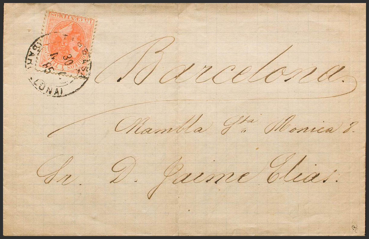 210. 1885. 15 orange cts. TARRASA to BARCELONA. Clover postmark TARRASA / (BARCELONA). MAGNIFICENT. Ex-Blight.