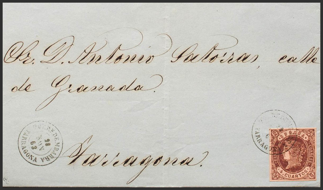 58. 1863. 4- cuartos chestnut. TORREDEMBARRA to TARRAGONA. Postmark TORREDEMBARRA / TARRAGONA. MAGNIFICENT AND RARE. Ex-Blight.