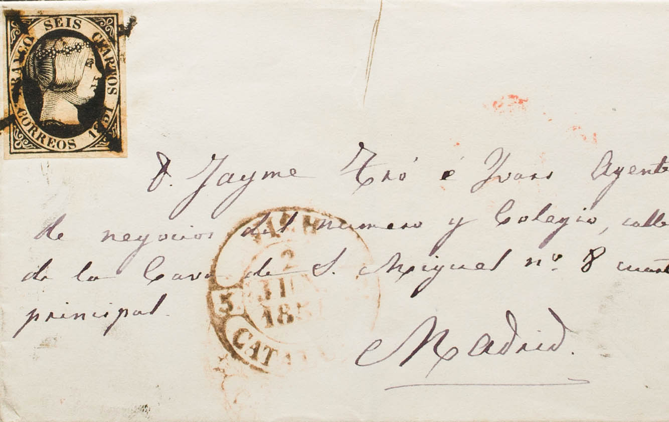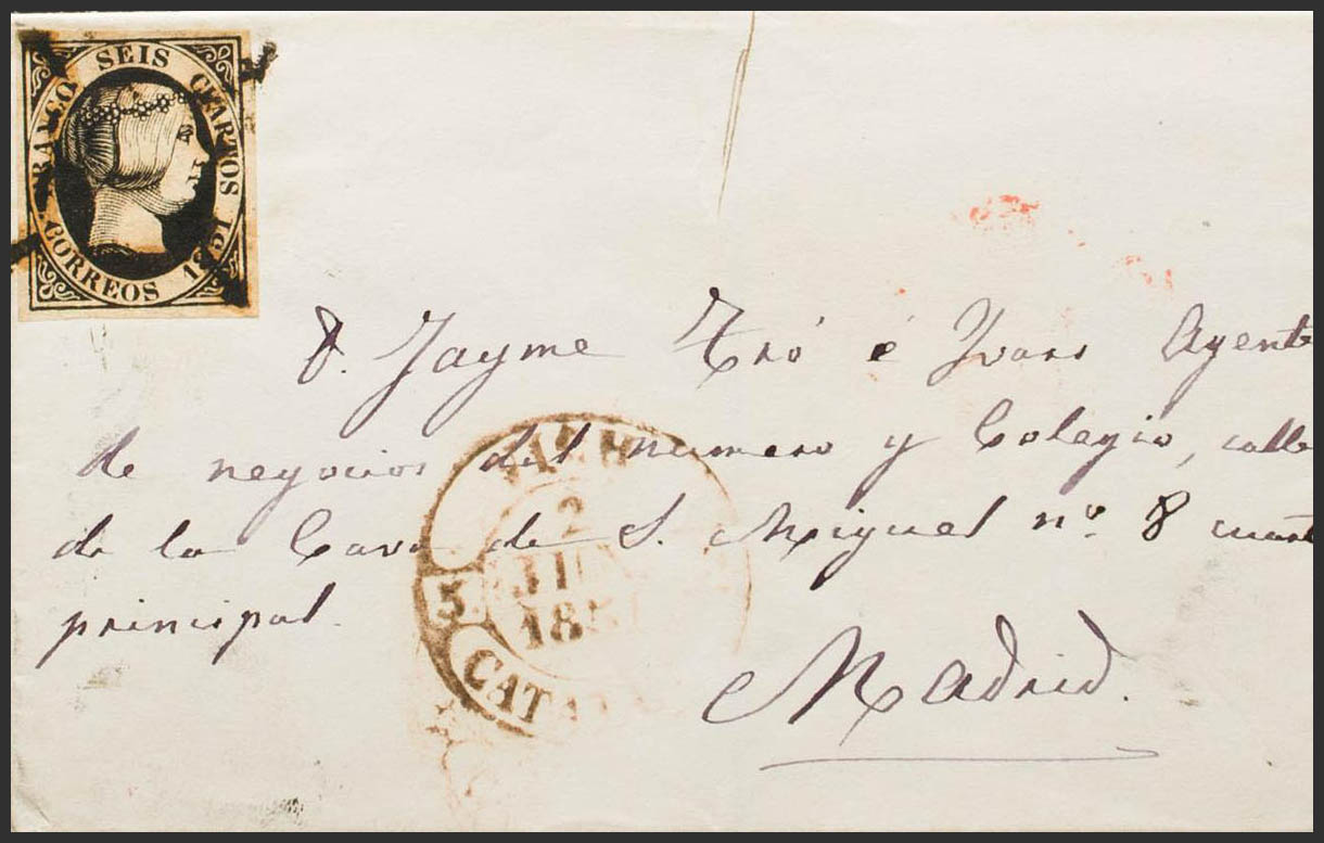 6. 1851. 6 cuartos black. VICH to MADRID. In the front baeza VICH / CATALONIA. MAGNIFICENT. Ex-Blight.