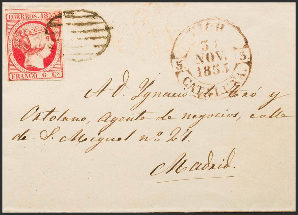 English 17. 1853. 6 cuartos pink. VICH to MADRID. In the front baeza VICH / CATALONIA. MAGNIFICENT. Ex-Blight.