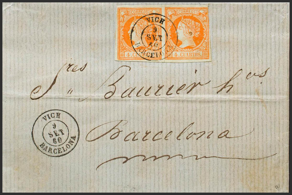 English 52(2). 1860. 4 cuartos orange, pair. RODA to BARCELONA. Postmark VICH / BARCELONA, double bearing. MAGNIFICENT. Ex-Blight.