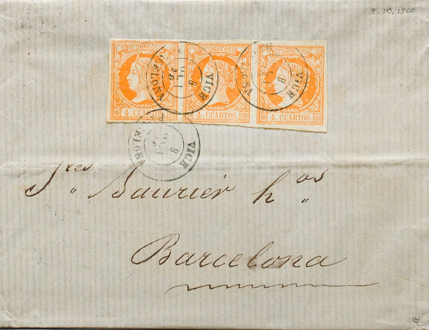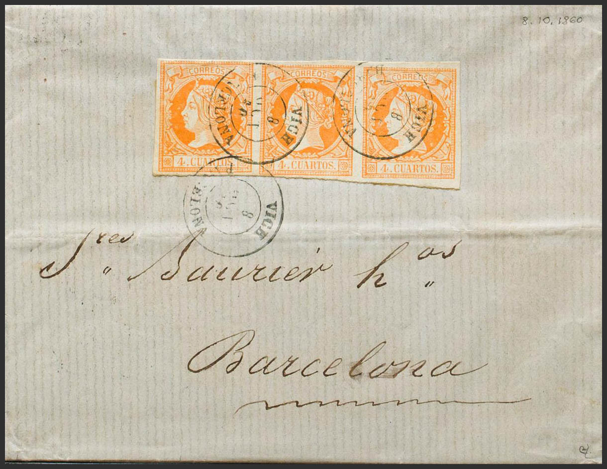 52(3). 1860. 4 orange cuartos , strip of three. RODA to BARCELONA. Postmark VICH / BARCELONA. Triple postage. MAGNIFICENT AND RARE. Ex-Blight.