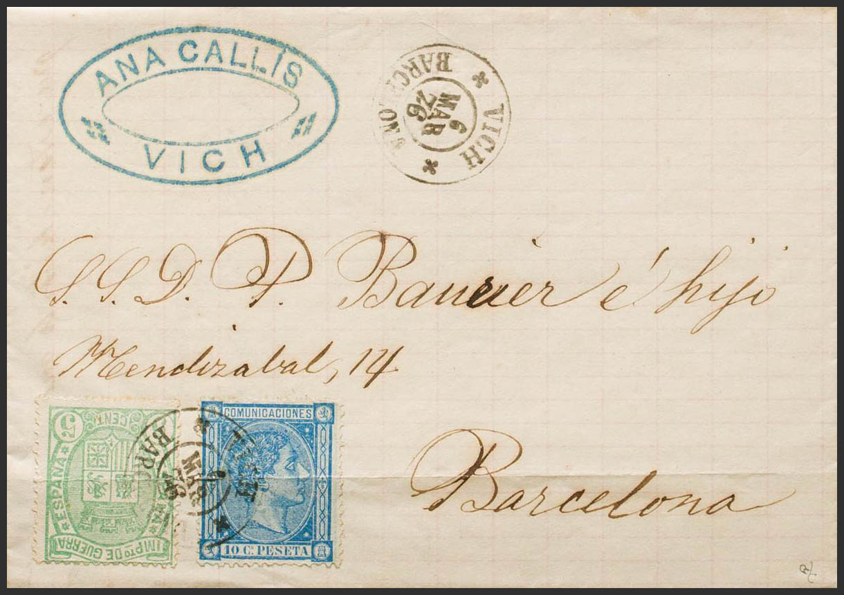 164, 154. 1876. 10 cts blue and 5 cts green (file fold). VICH to BARCELONA. Special postmark (with decorations) VICH / BARCELONA. PRETTY. Ex-Blight.
