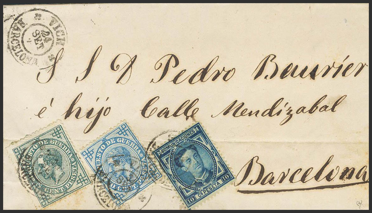 175, 183, 184. 1877. 10 cts blue, 5 cts green, and 10 cts blue (slight archival crease). VICH to BARCELONA. Postmark VICH / BARCELONA. BEAUTIFUL AND UNUSUAL POSTAGE COMBINATION. Ex-Blight.